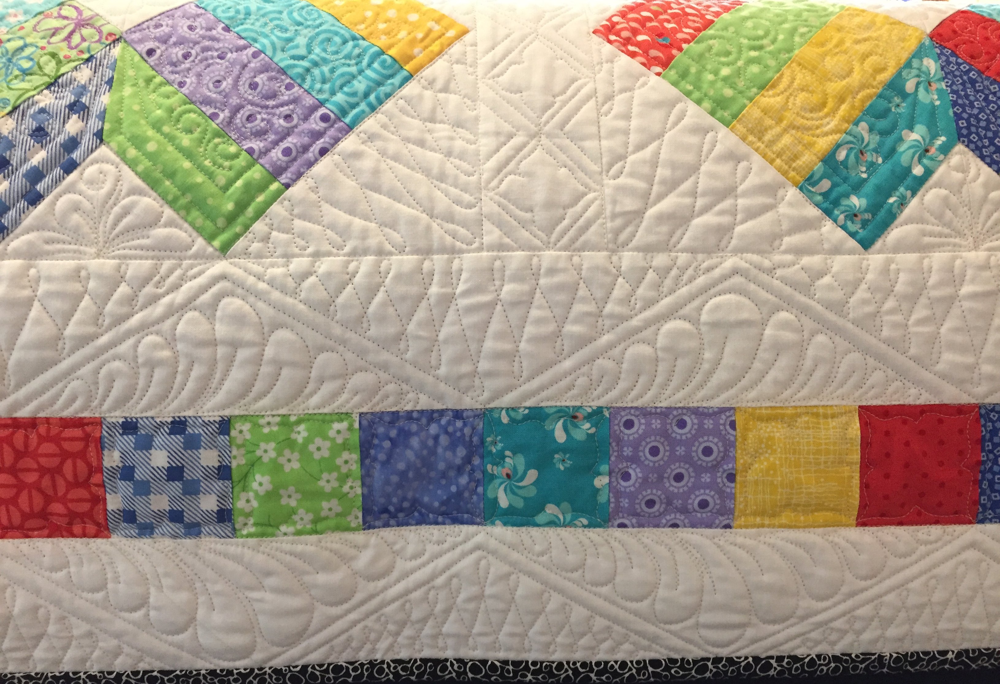 A scrappy bright quilt to welcome the new baby. Free-hand quilted with swirls and flowers.