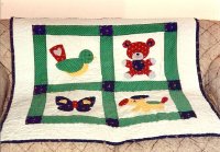 A baby gift in soft spring colors. Quilted in an all-over vine swirl with flowers.