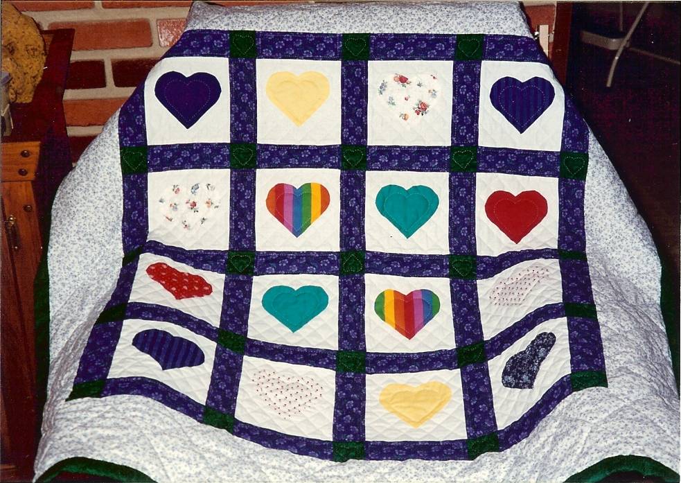 Welcoming a new baby, this quilt uses memorabilia items from three generations, including a wedding dress, needlepoint, shirts and a professional patch. Custom quilted with a variety of designs including piano keys, swirls and orange peels.