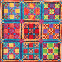 A traditional nine-patch set and quilted in a modern way. Quilting motifs include feathers, orange peels and swirls.