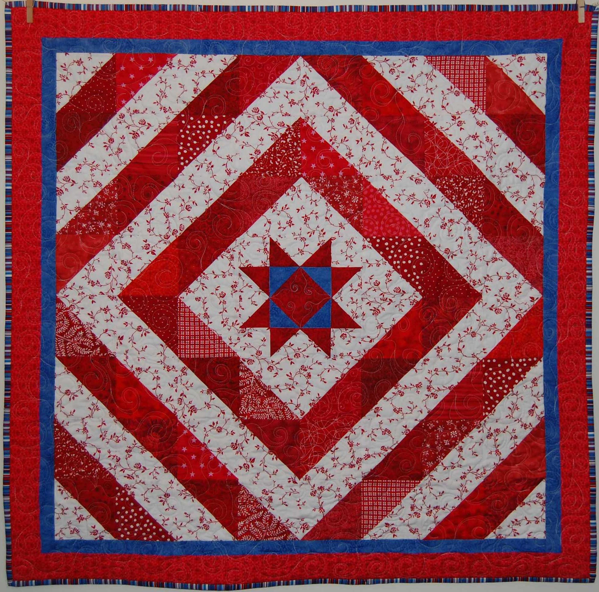 A Scrappy red, white and blue quilt featuring windmill blocks. Machine quilted with swirls to give it movement.