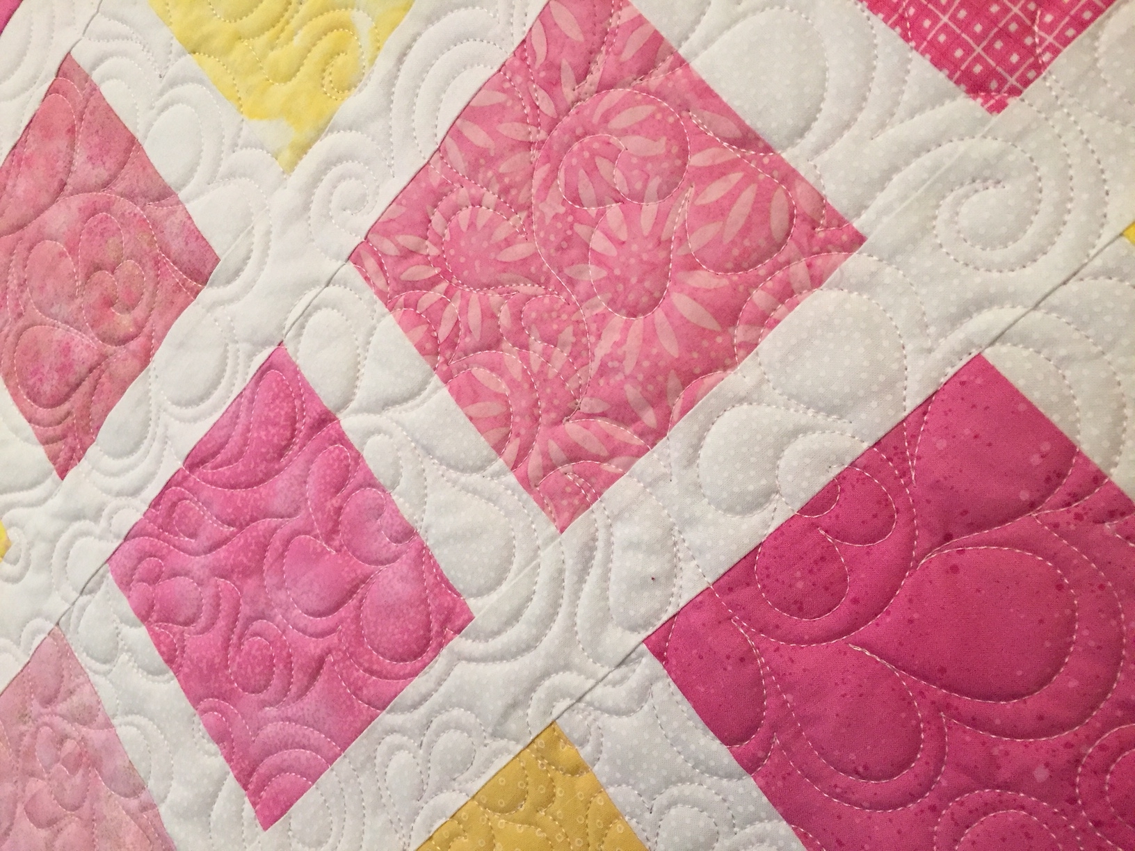 Cheerful pinks and yellows to welcome a baby daughter. Quilted with an overall design of feathered swirls.