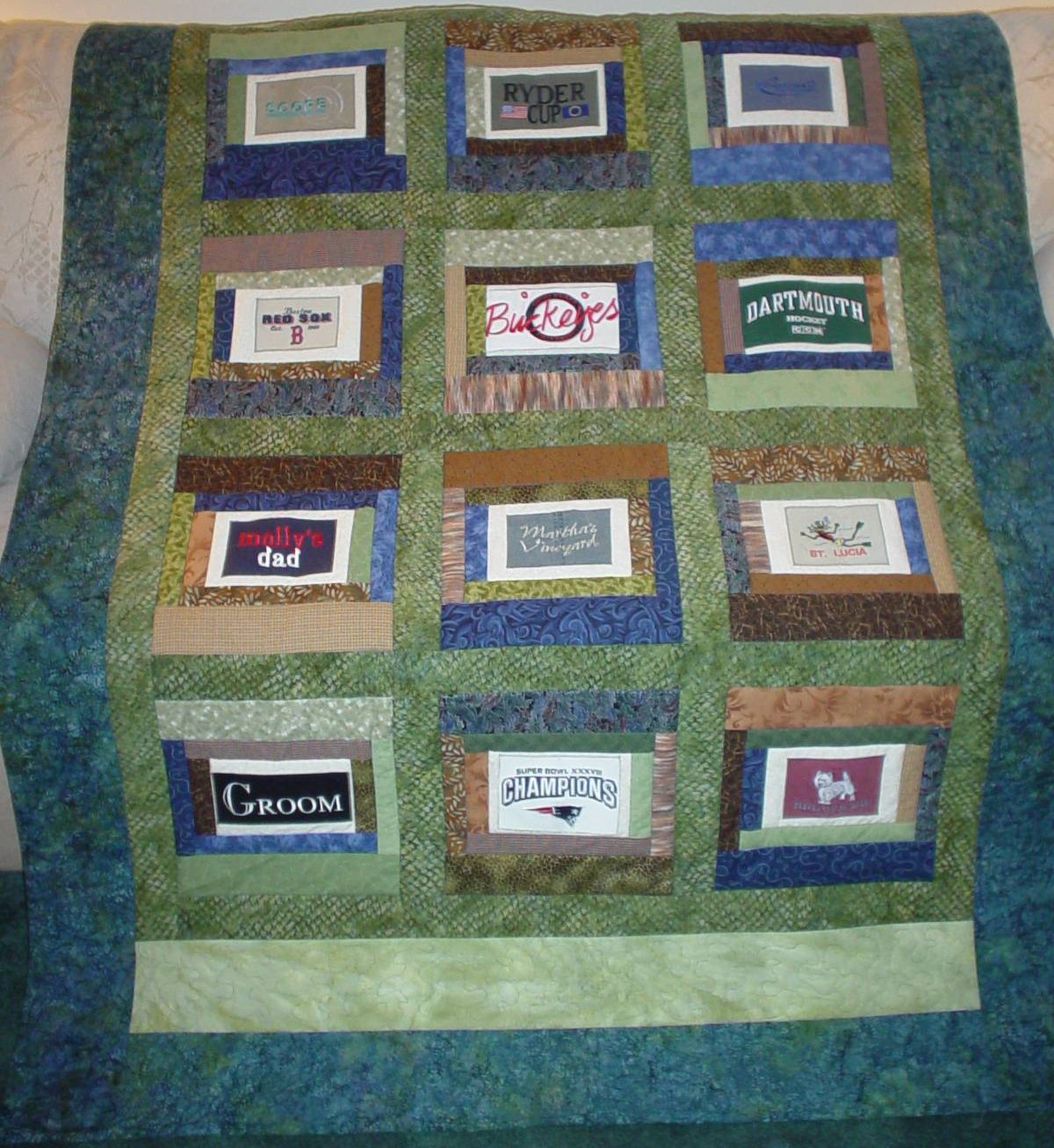 A memorial quilt which features t-shirts, sweatshirts, pajamas, robes, vests, and hat logos. Appliquéd to the quilt top are a pair of silk slippers and the pockets from an often-worn vest.