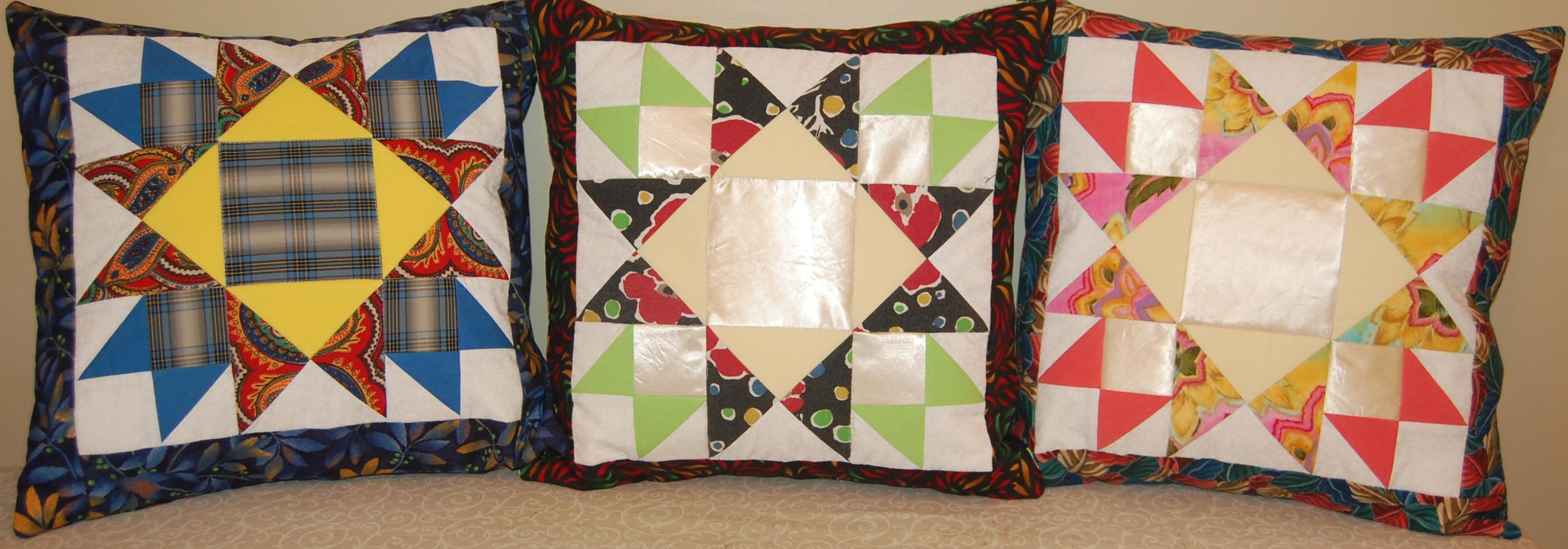 Using the extra tie and shirt fabrics, these pillows match the previous quilts. The pillow backs are made from shirt fronts.