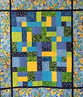The ever-popular Yellow Brick Road pattern in blue, green and yellow. Quilted with an all-over loop-de-loop.