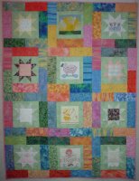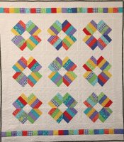 Scrappy teals and blues to welcome the new baby. Quilted in an all-over swirl design.