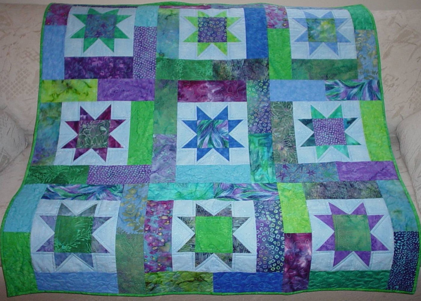 A baby gift for a family member, this quilt features batik stars in teals, purples, and greens.