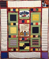 Welcoming a new baby, this quilt uses memorabilia items from three generations, including a wedding dress, needlepoint, shirts and a professional patch. Custom quilted with a variety of designs including piano keys, swirls and orange peels.