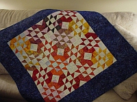 A Scrappy red, white and blue quilt featuring windmill blocks. Machine quilted with swirls to give it movement.