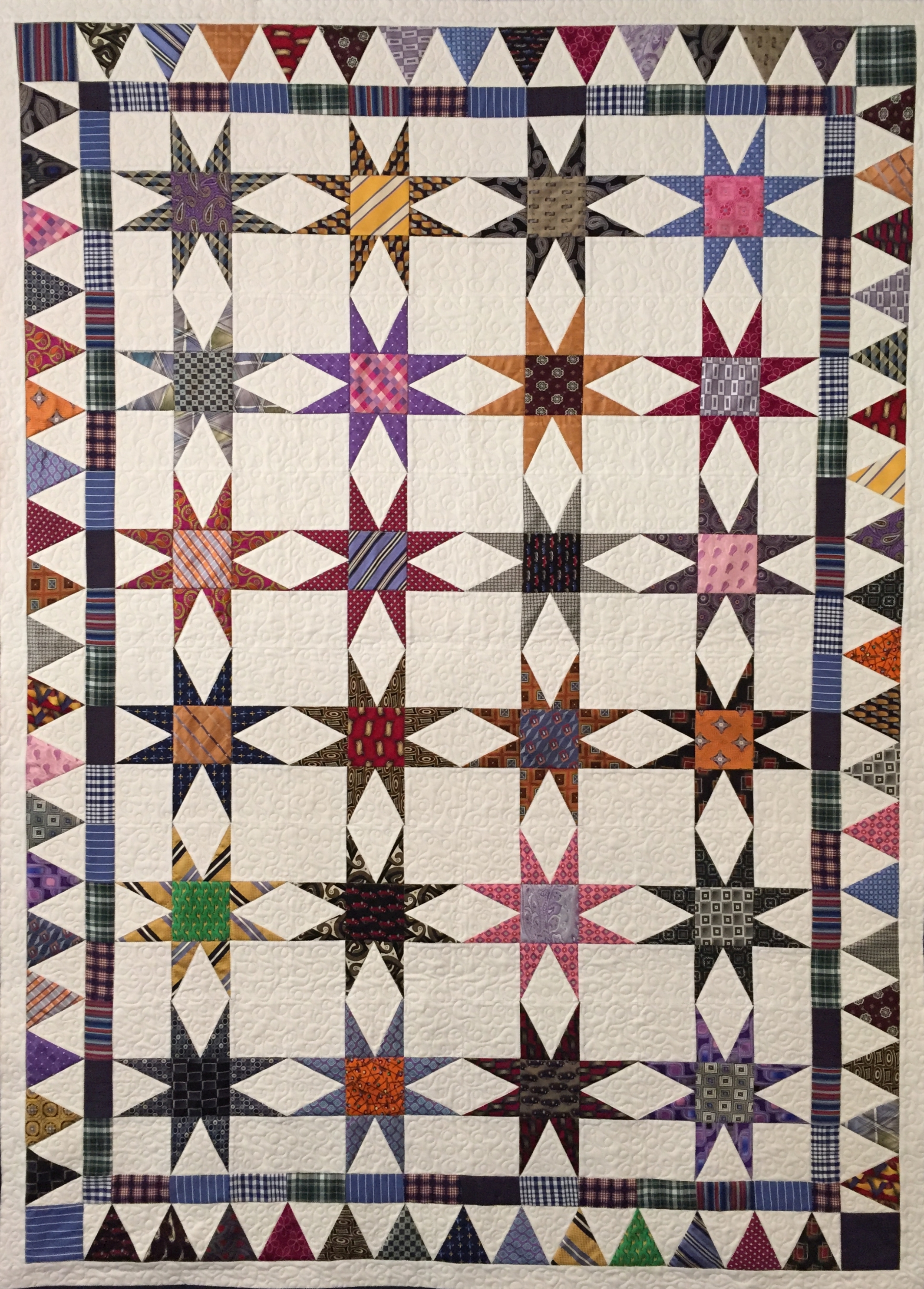 Made in memory of a beloved father, this quilt was made from his silk neckties. The border surrounding the center medallion features fabric from corduroy pants. Machine quilted in an all-over meander.
