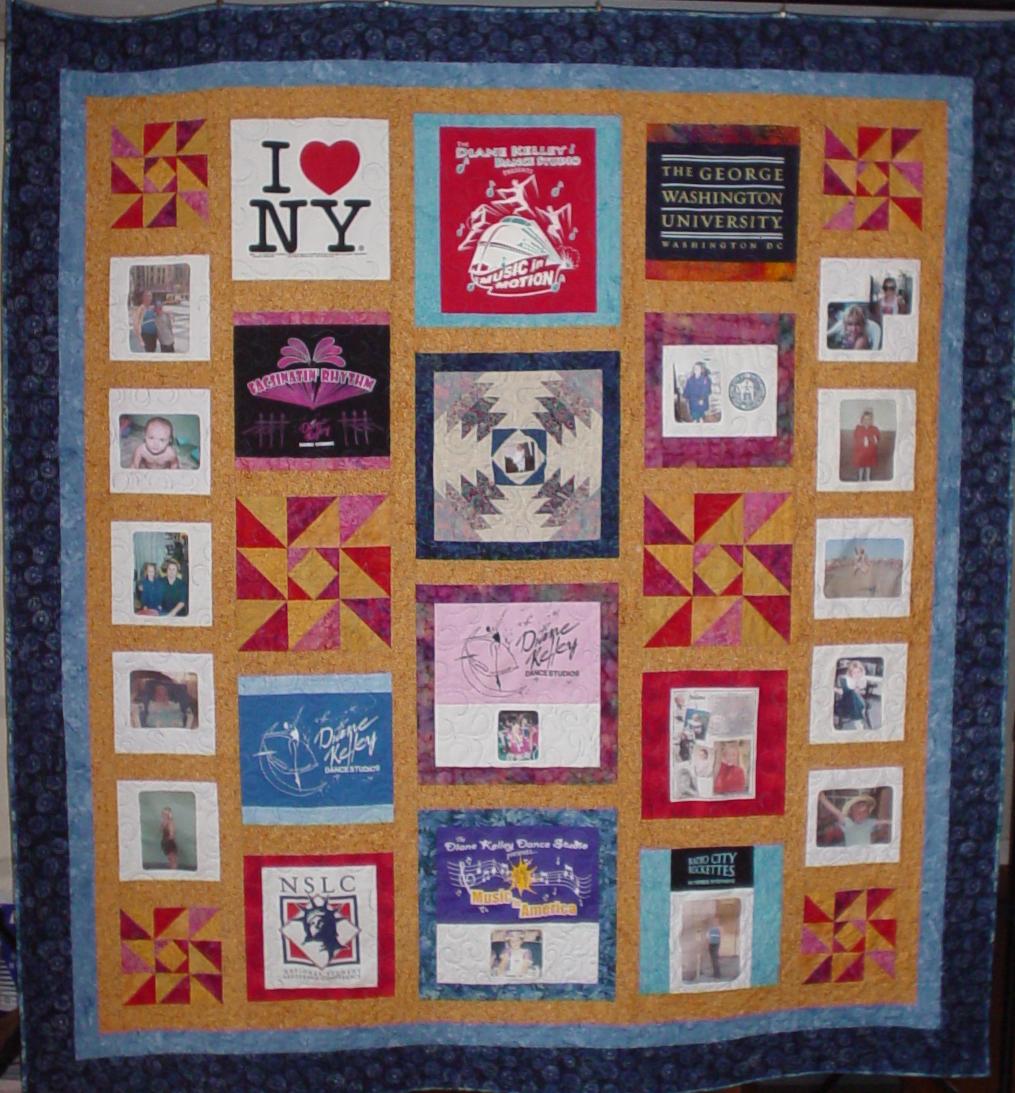This quilt tells the story of a dancer, featuring t-shirts, photos and several "star" blocks.